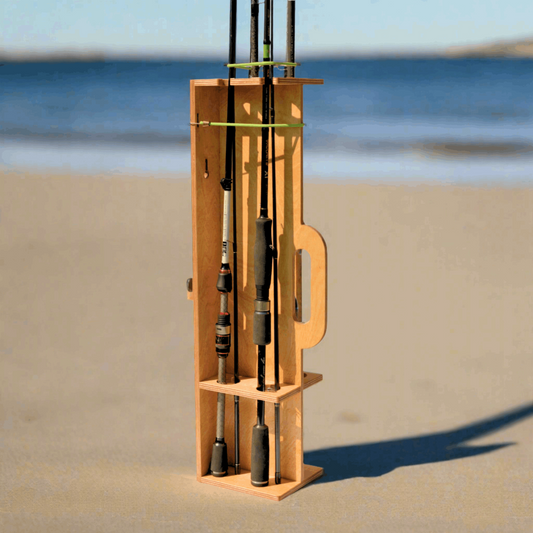 Mobilus meškerių stovas su rankena. Mobilus meškerių dėklas skirtas 4 vnt. meškerėms.